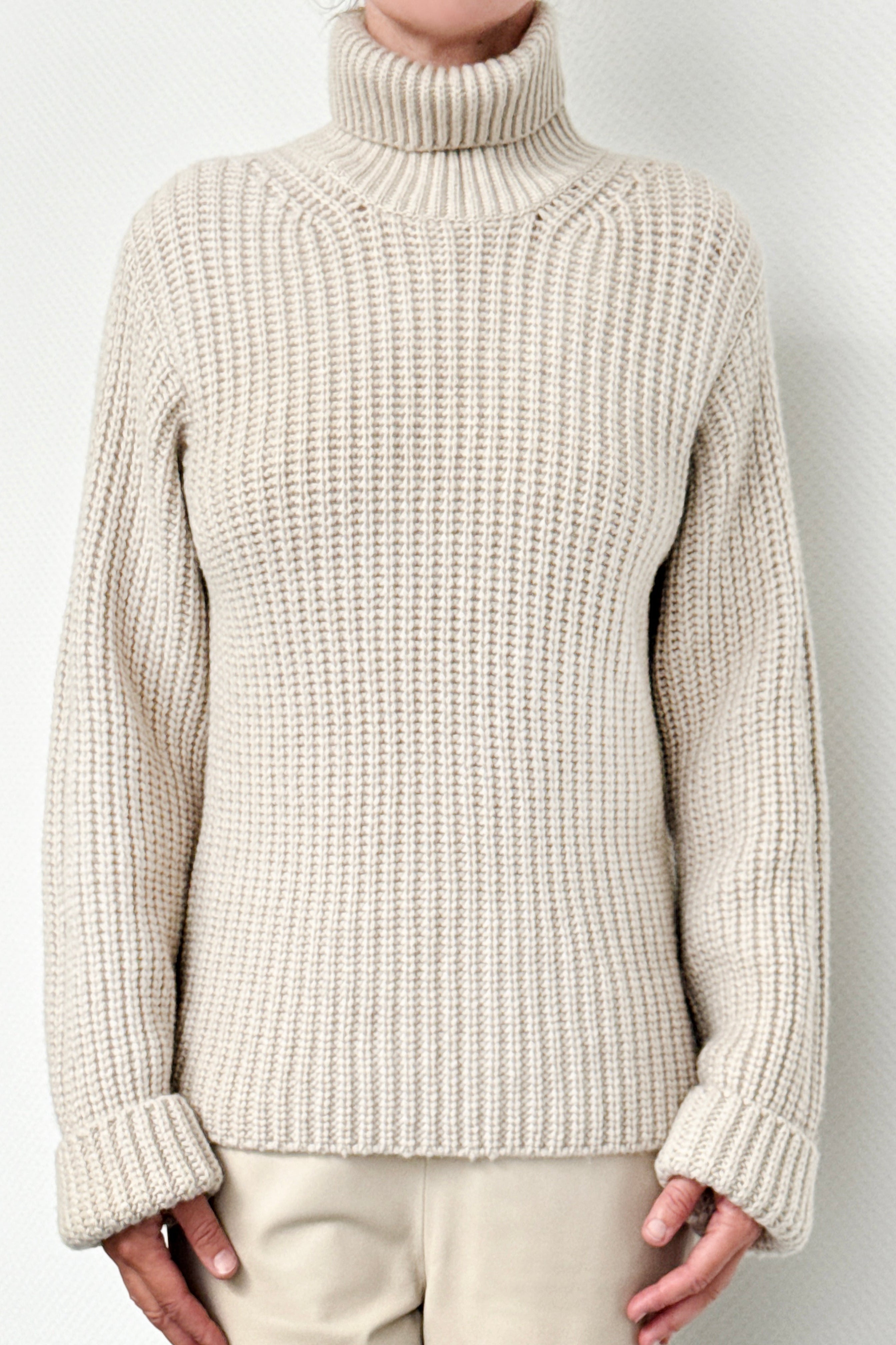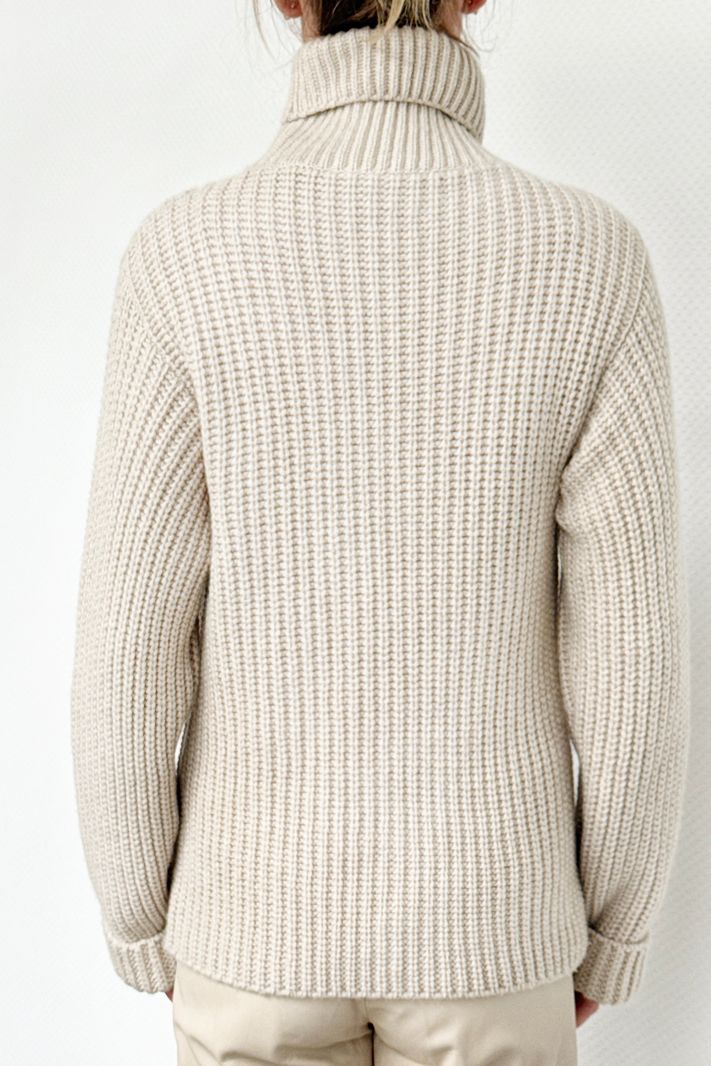 In Italien aus reinem, grob gestricktem Kaschmir gefertigt, besticht er mit strukturiertem Rollkragen und entspannter Silhouette, die wohlig umhüllt.