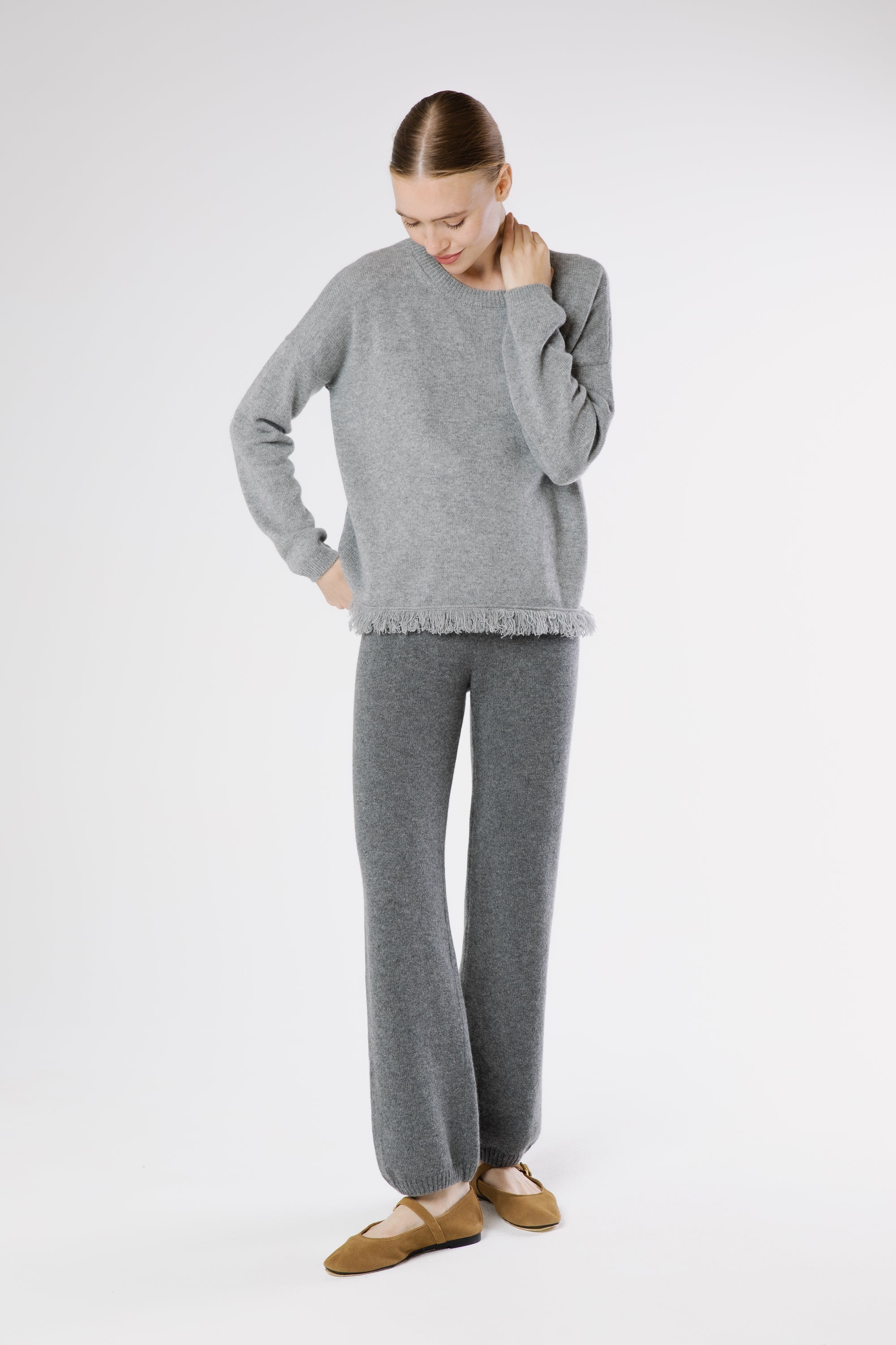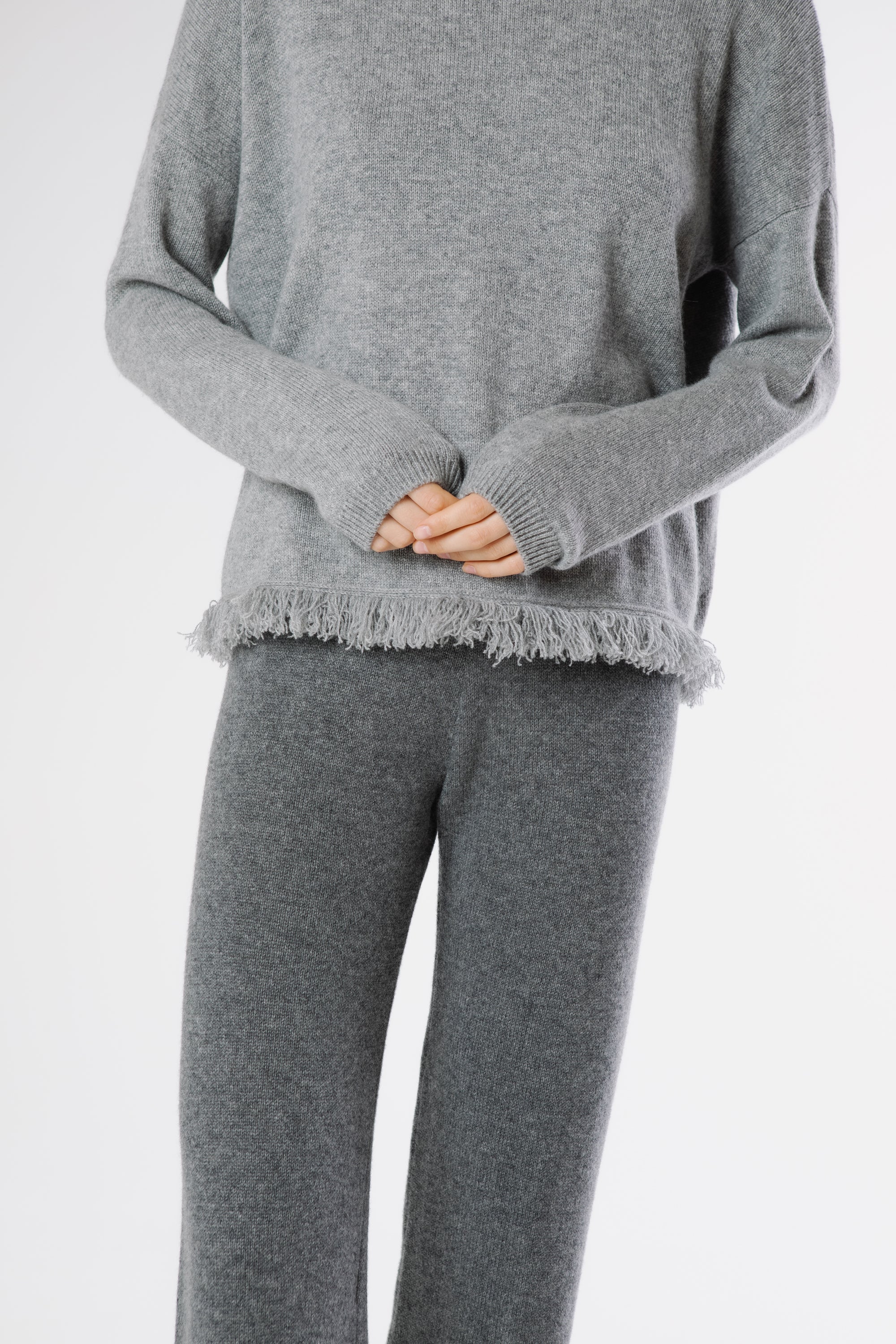 Mit weichem Rundhalsausschnitt, überschnittenen Schultern und feinen Fransen am Saum verbindet er Komfort mit subtiler Designraffinesse.