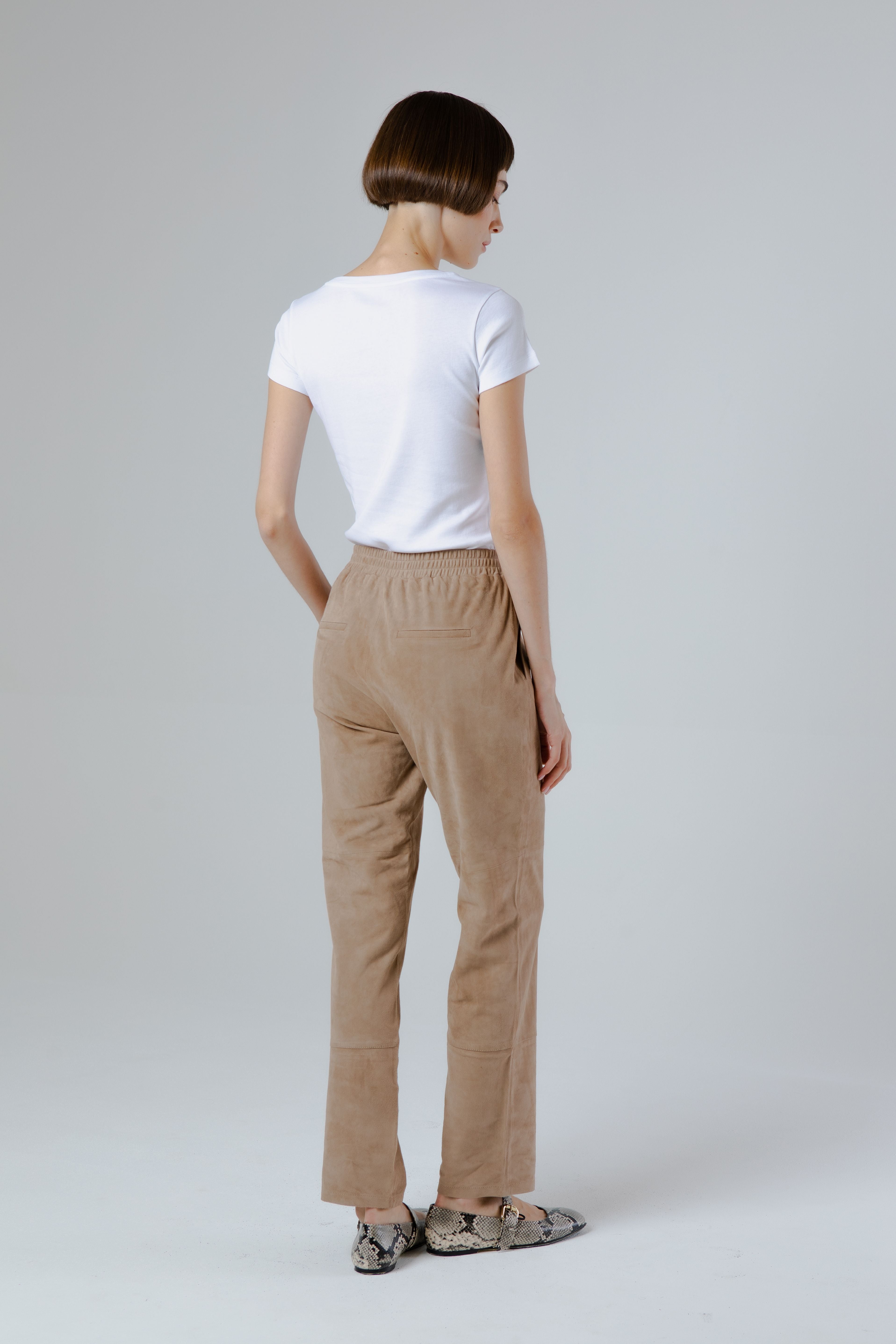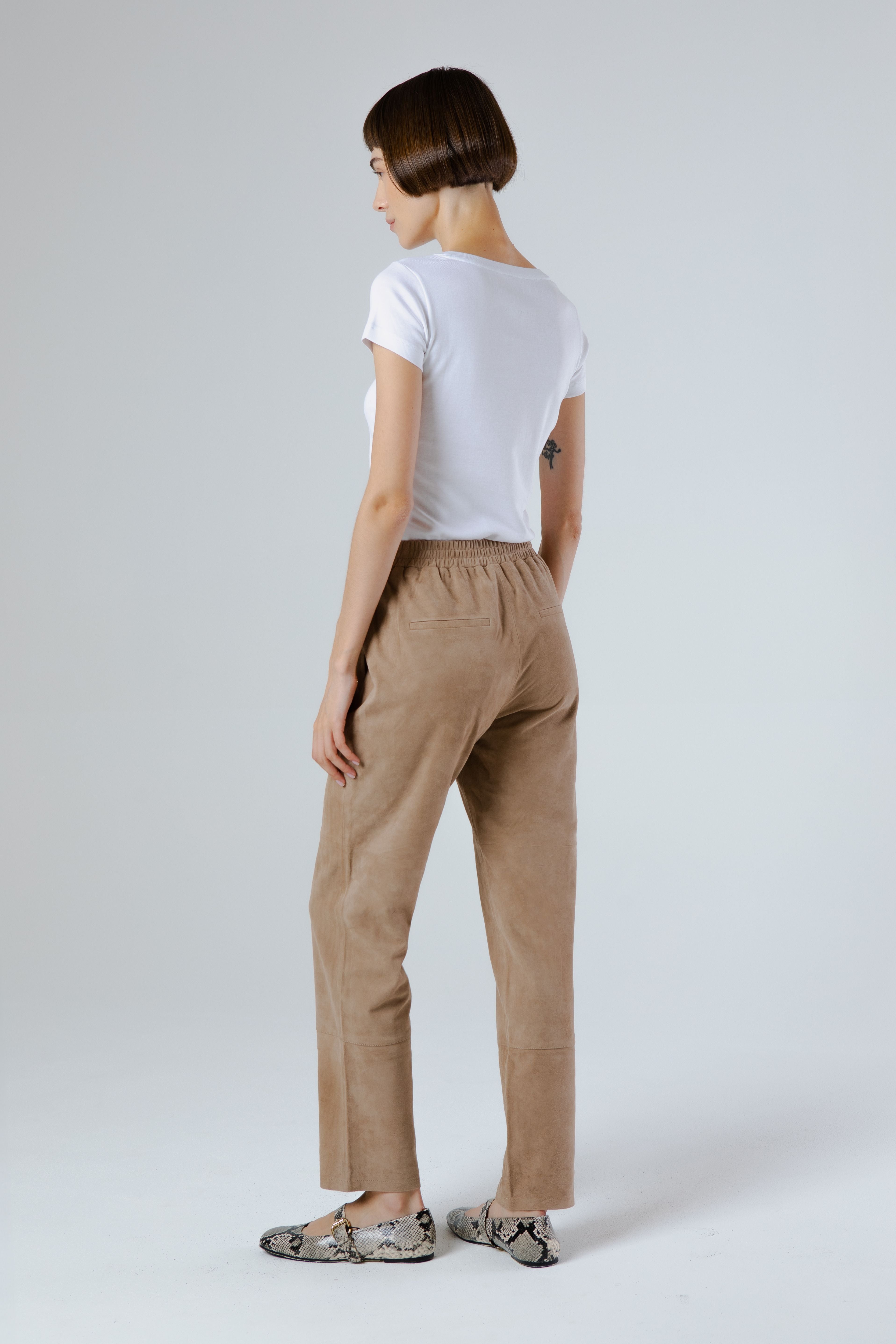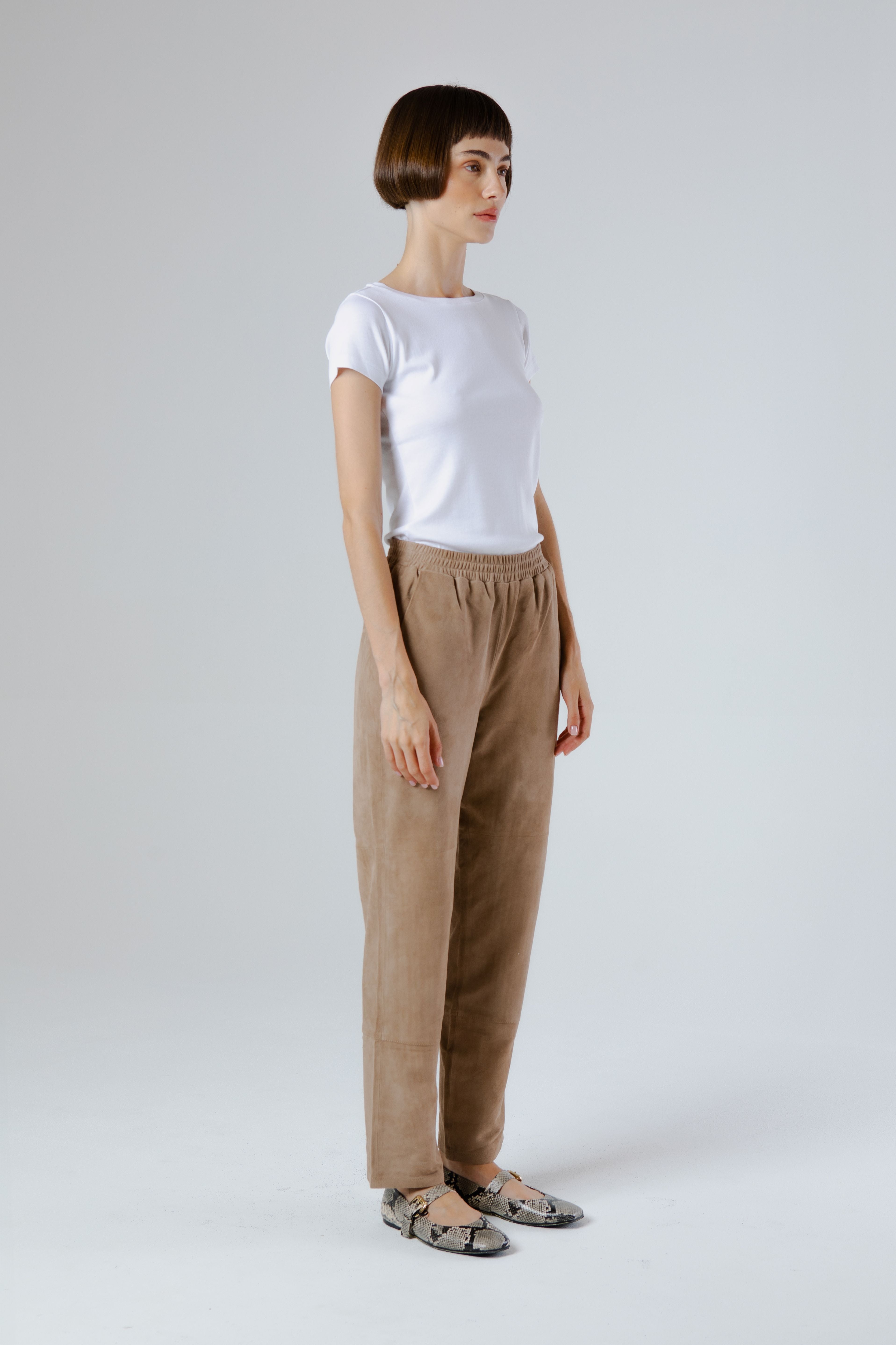 Styling-Tipp: In hoch taillierte beigefarbene Hosen gesteckt für einen mühelos zeitlosen Tageslook.