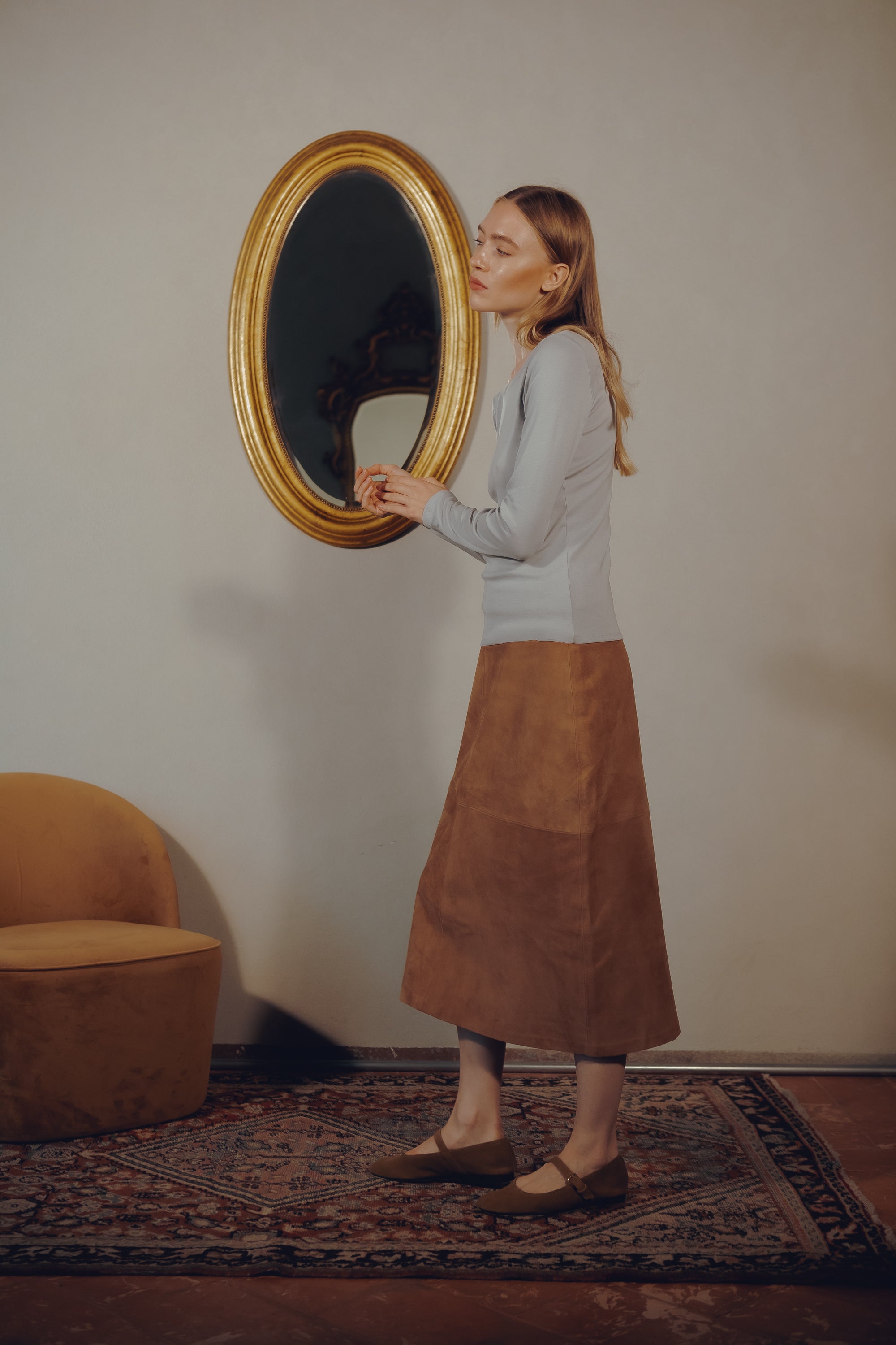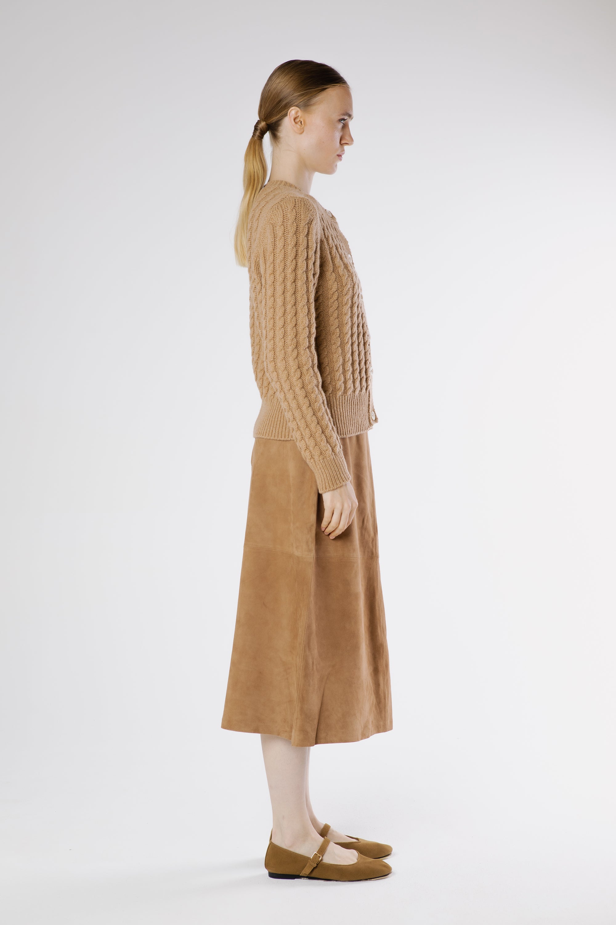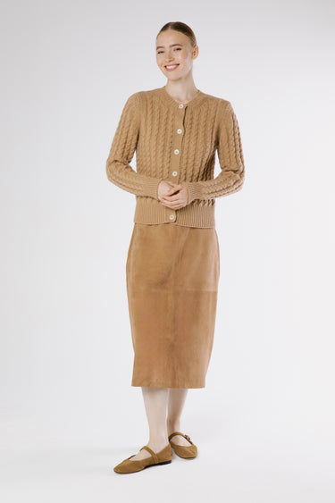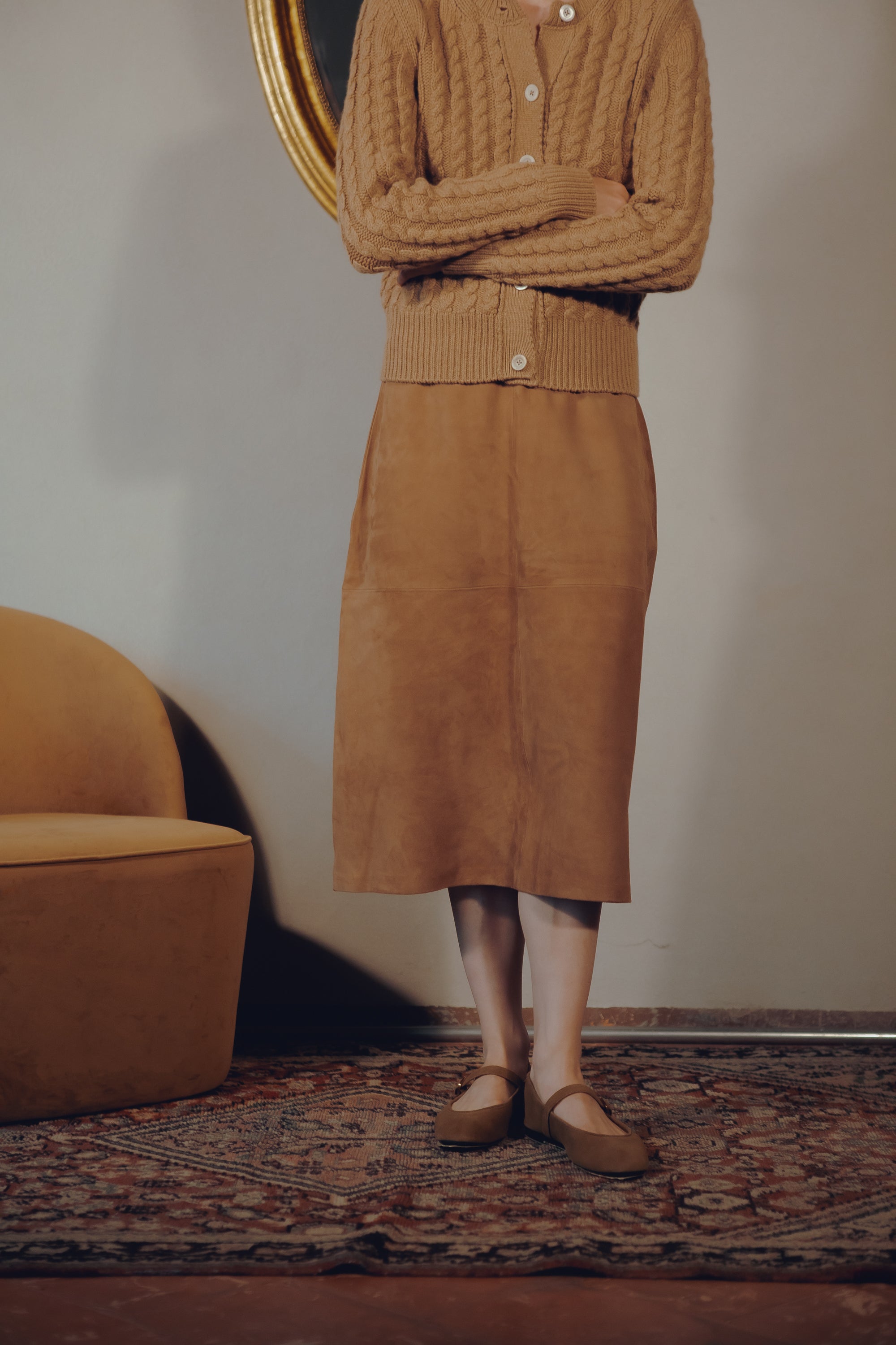 Der Carla GS Wildlederrock in Oak ist aus samtigem, leichtem Wildleder gefertigt, das weich entlang der Silhouette fällt und einen mühelos eleganten Look kreiert. Die Midilänge und die klaren Linien machen ihn zu einem vielseitigen Stück, das sich nahtlos vom Tag bis in den Abend tragen lässt.