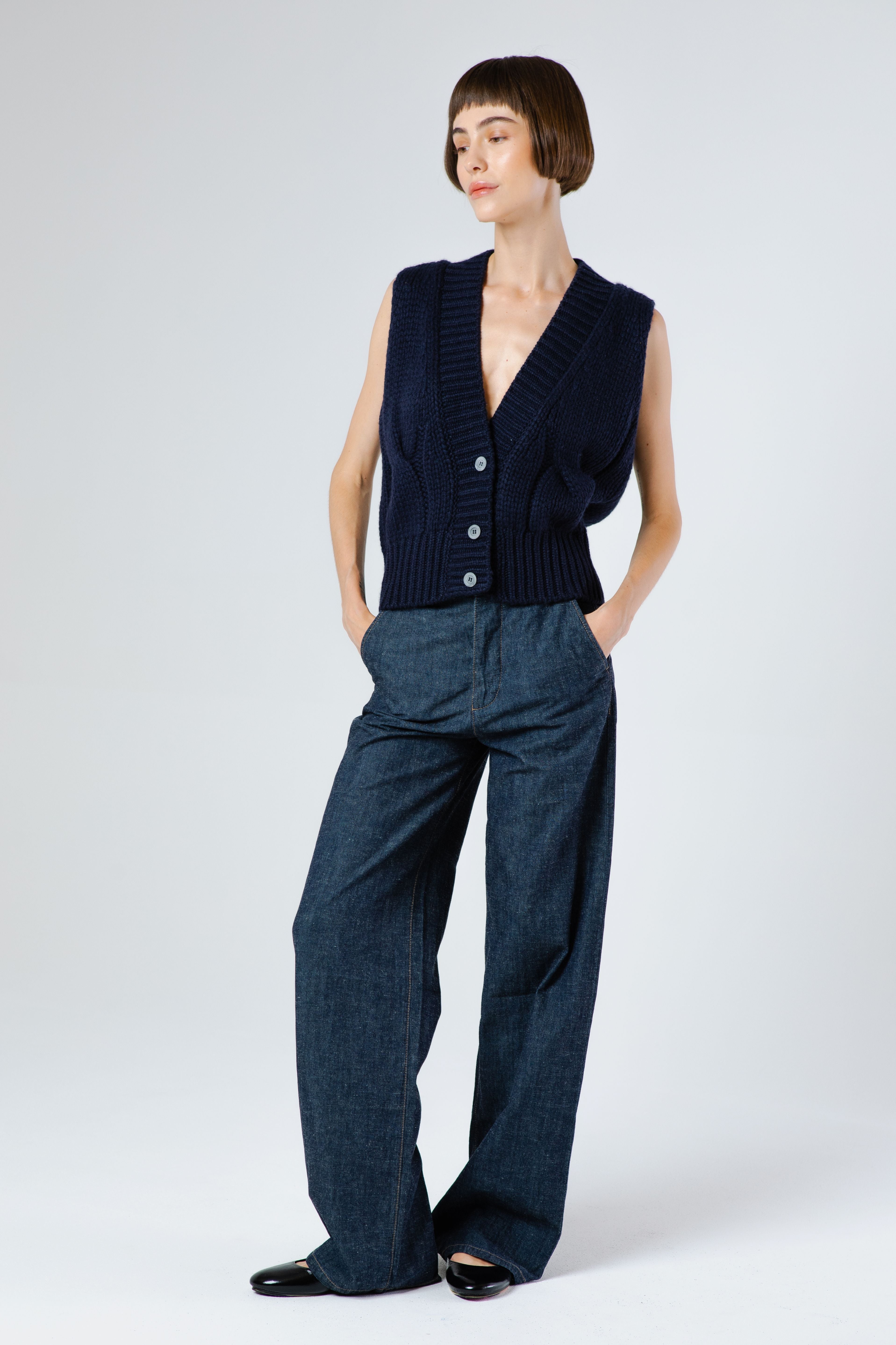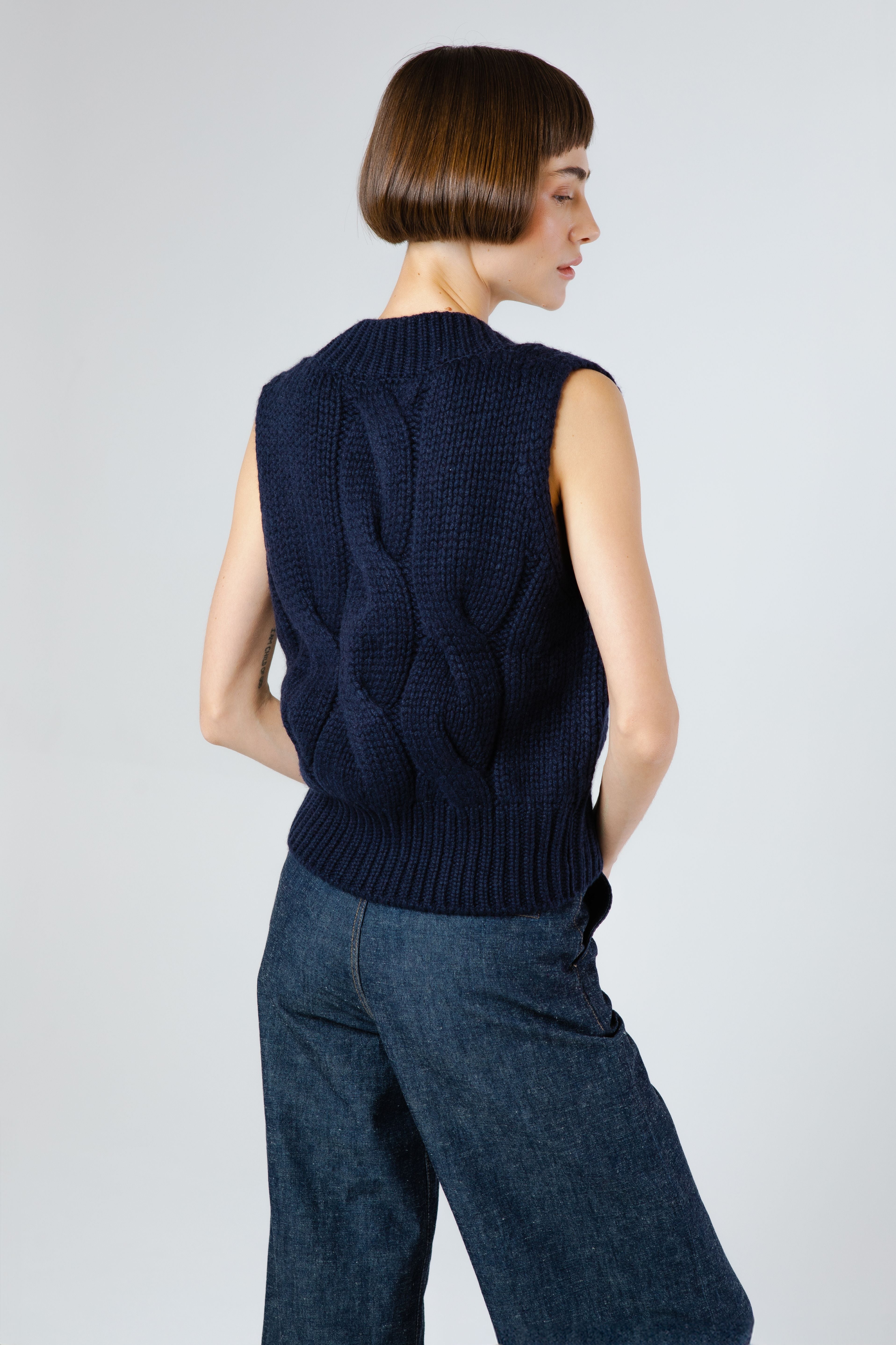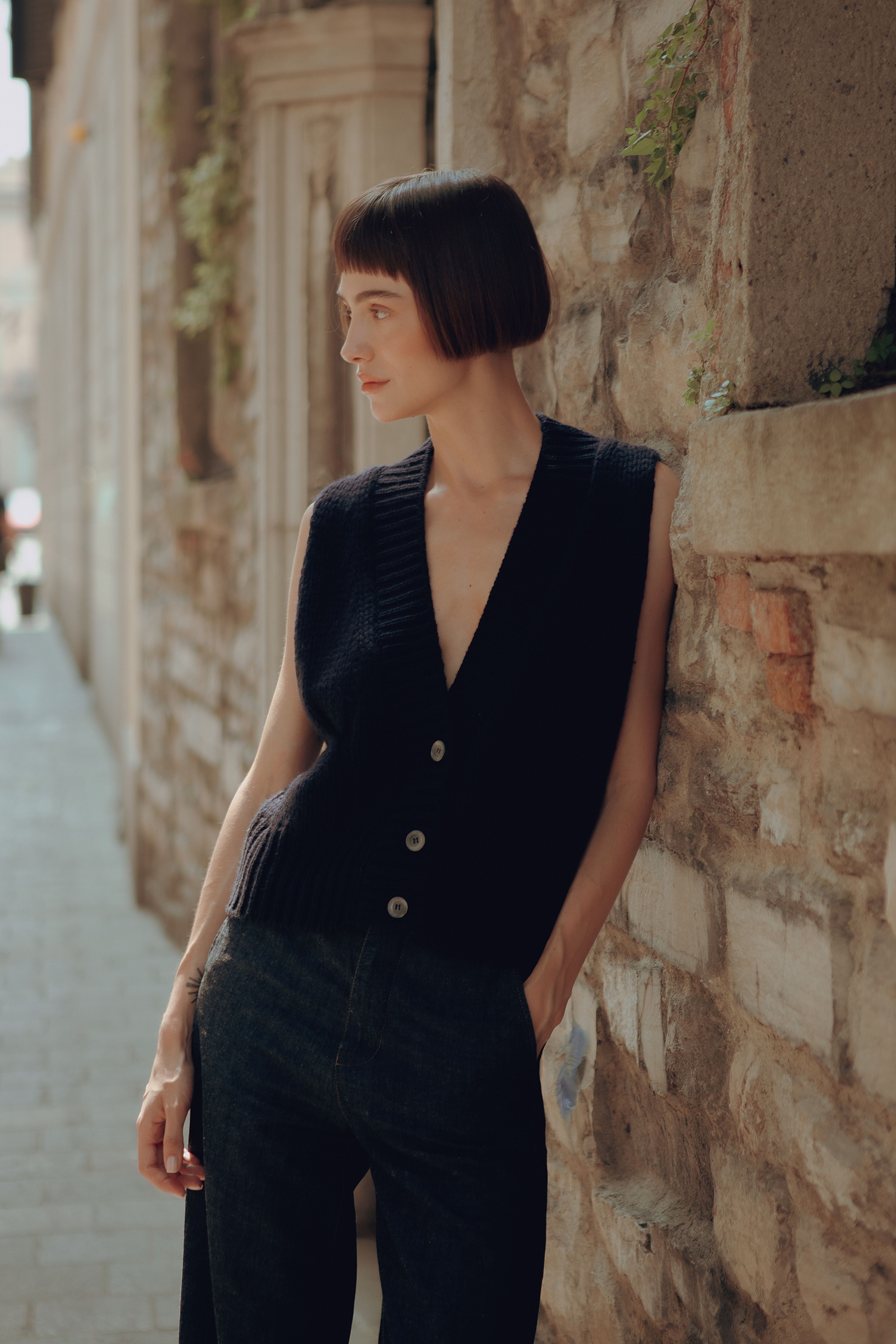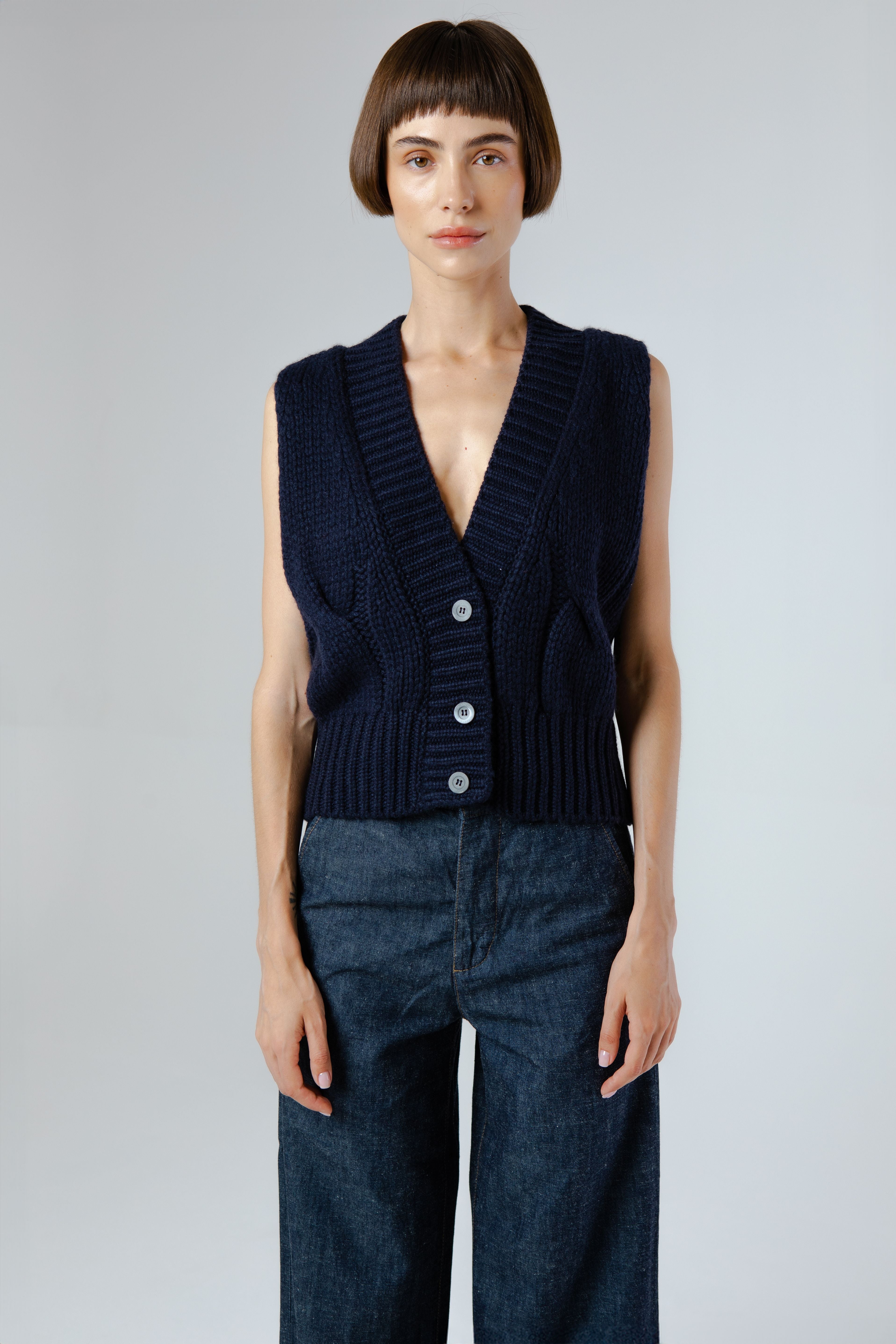 Aus ultrasoftem, nachhaltigem Kaschmir gefertigt, zeigt sie einen tiefen V-Ausschnitt, eine plastische Zopfstrickstruktur und eine elegante Knopfleiste. Das ärmellose Design verleiht vielseitige Modernität – ideal über Hemden, Blusen oder feinen Rollkragen.