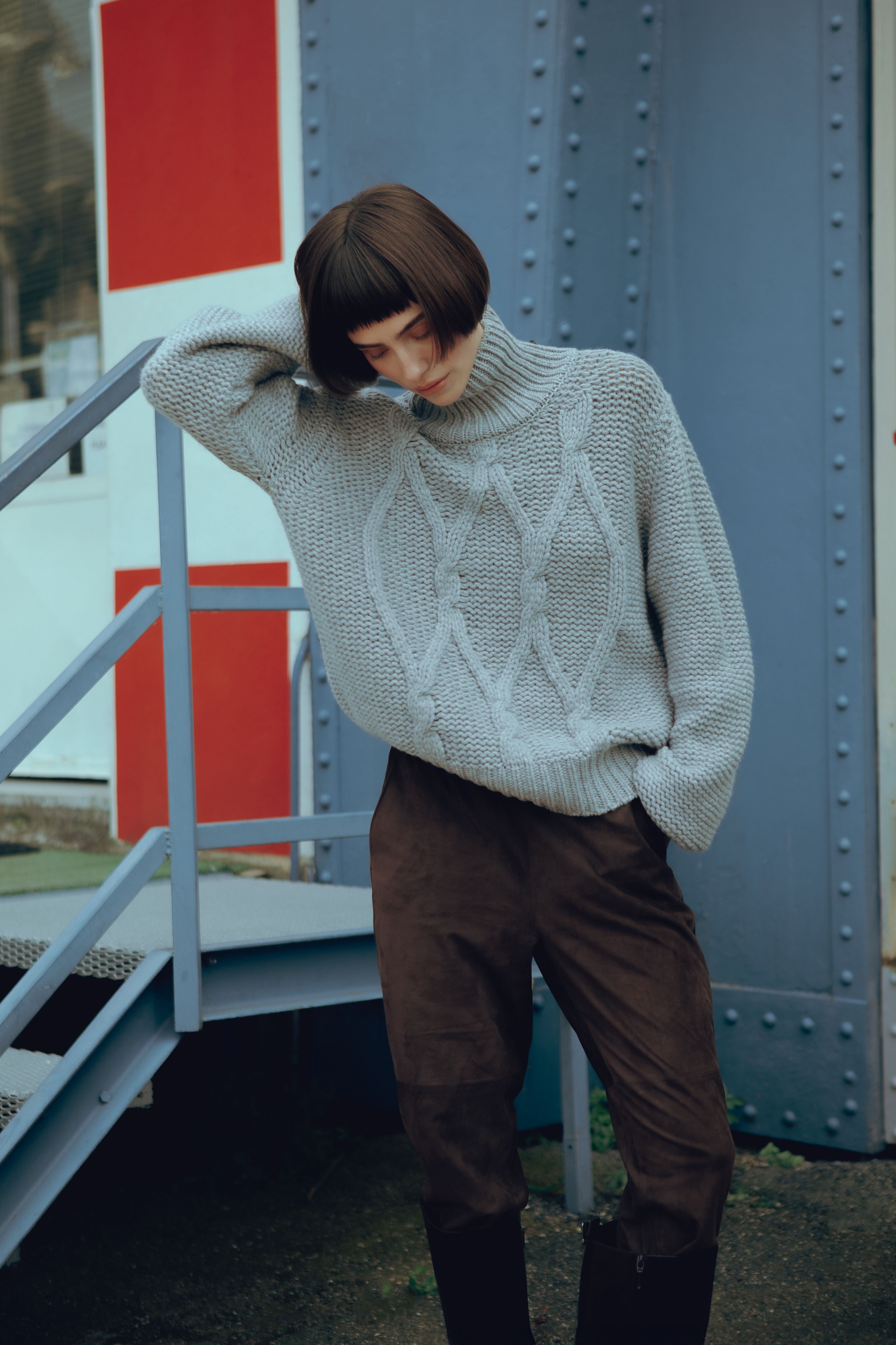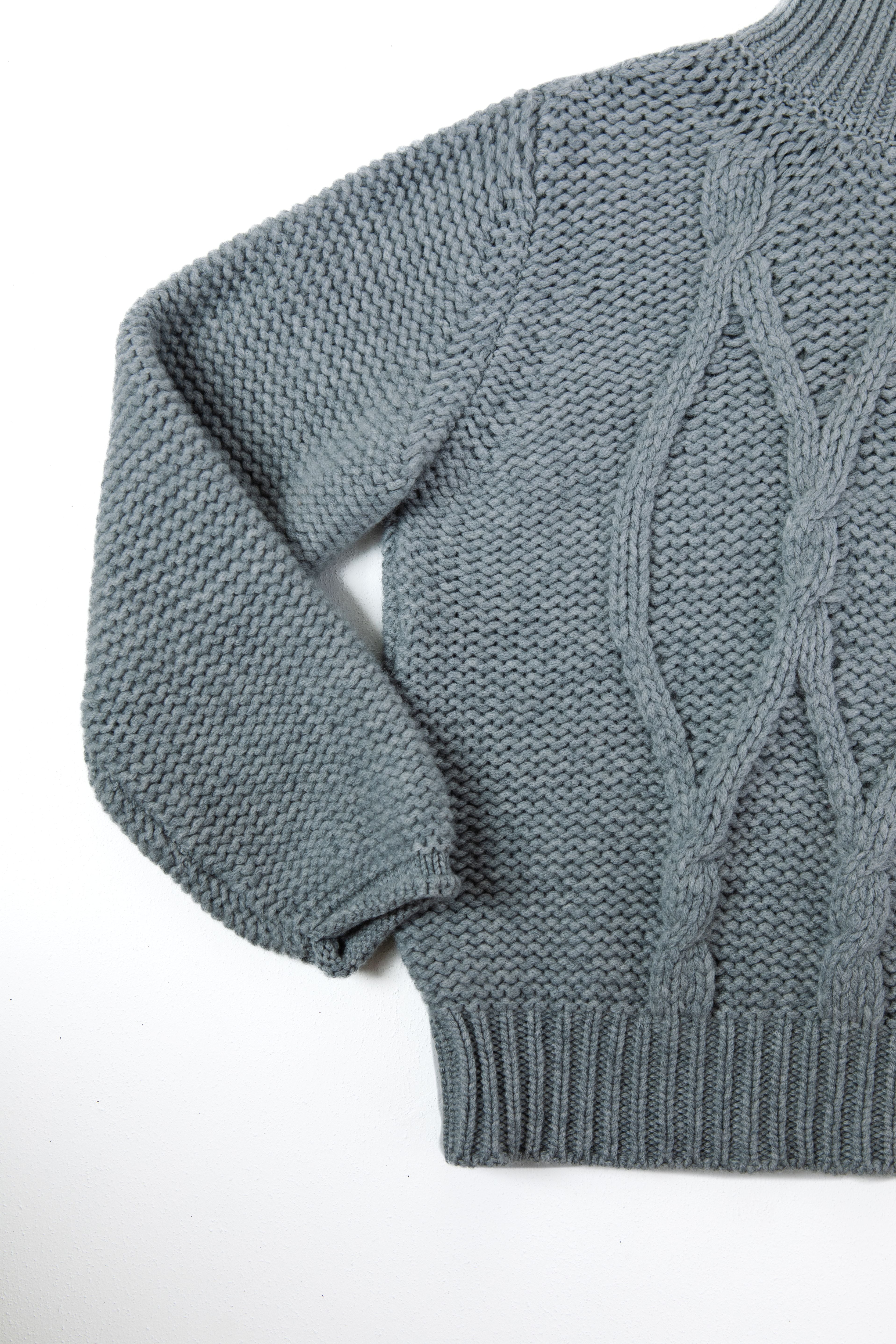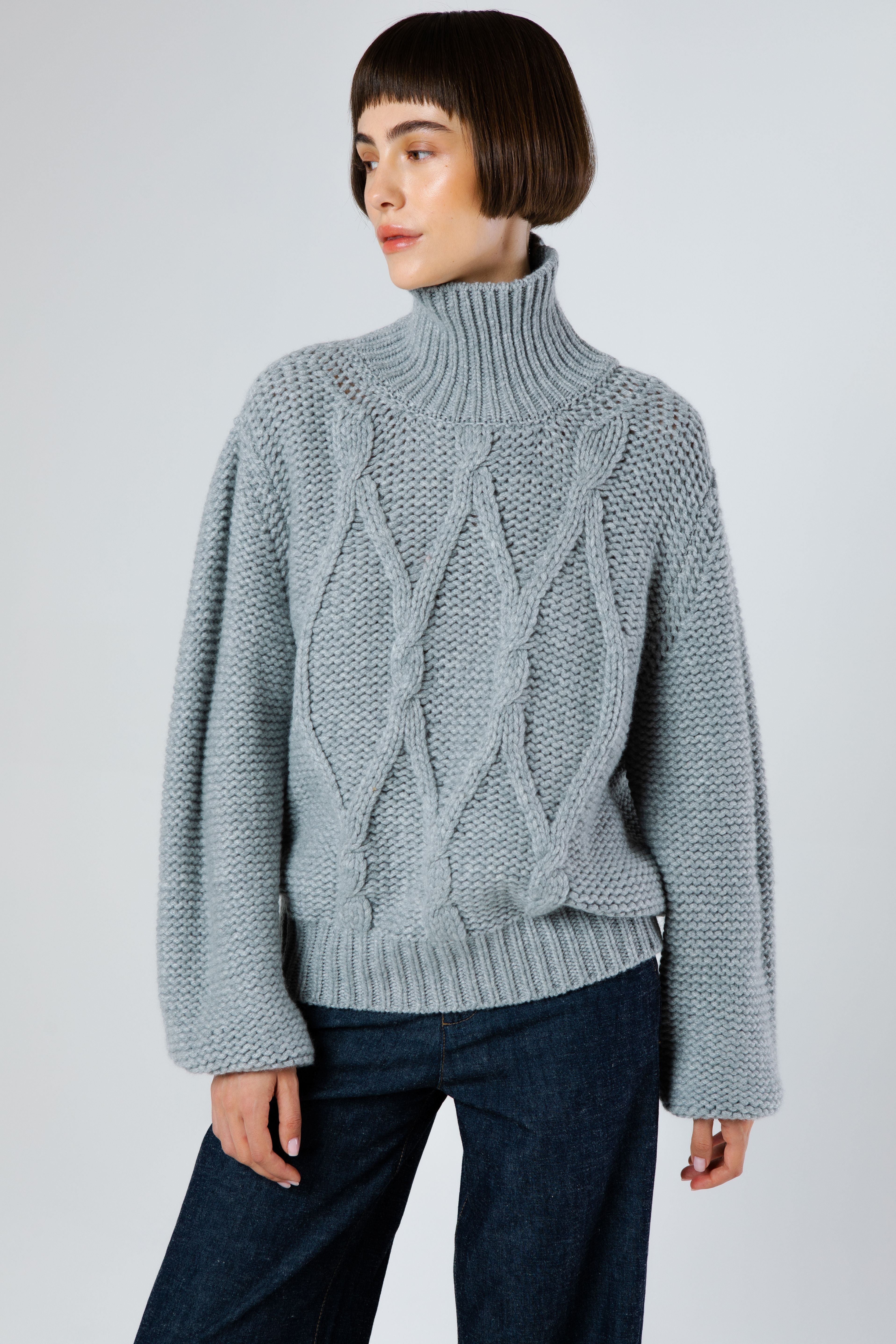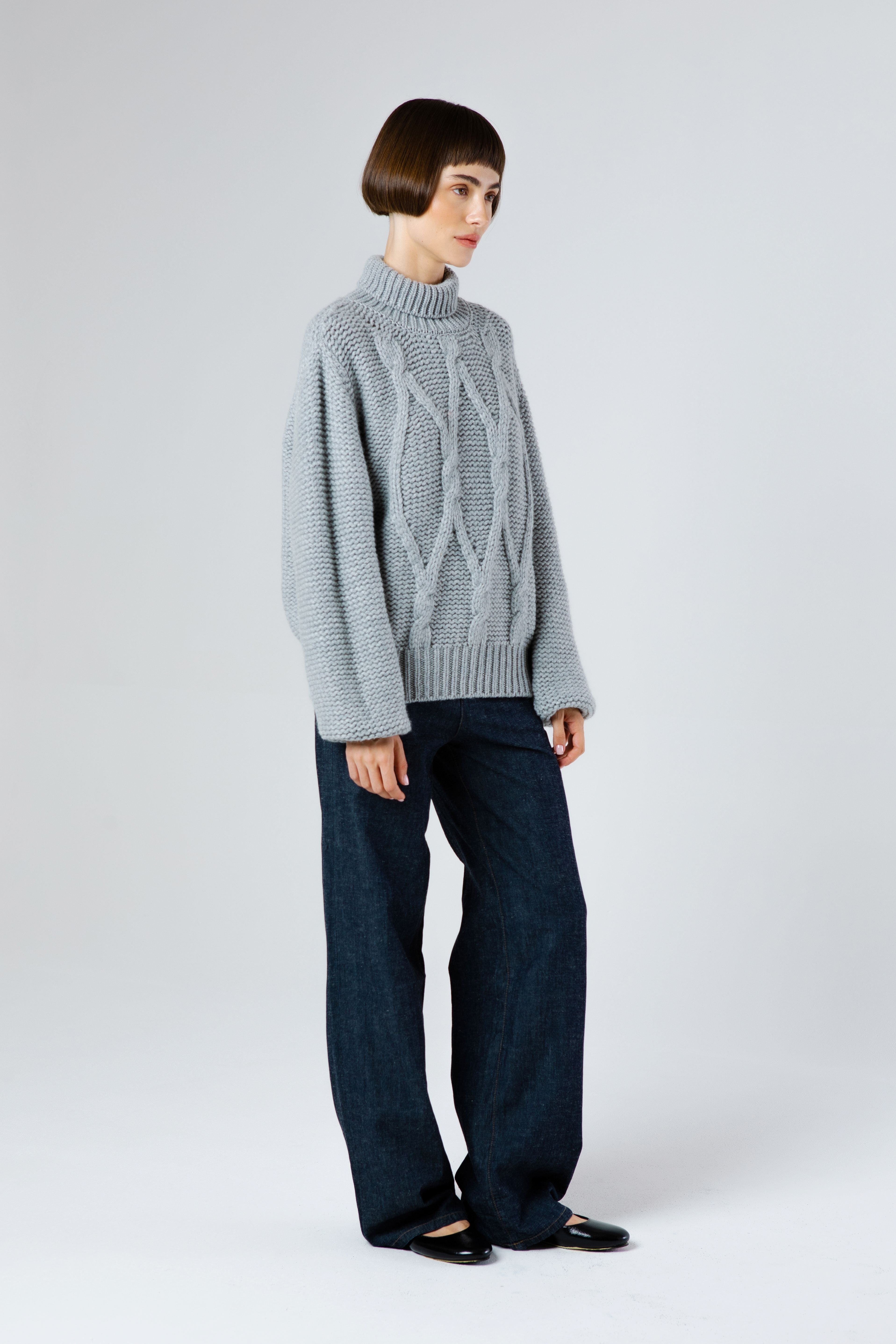 Aus reinem, nachhaltigem Kaschmir gefertigt, überzeugt er mit markantem Zopfmotiv, hohem Rippkragen und sanft ausgestellten Ärmeln.