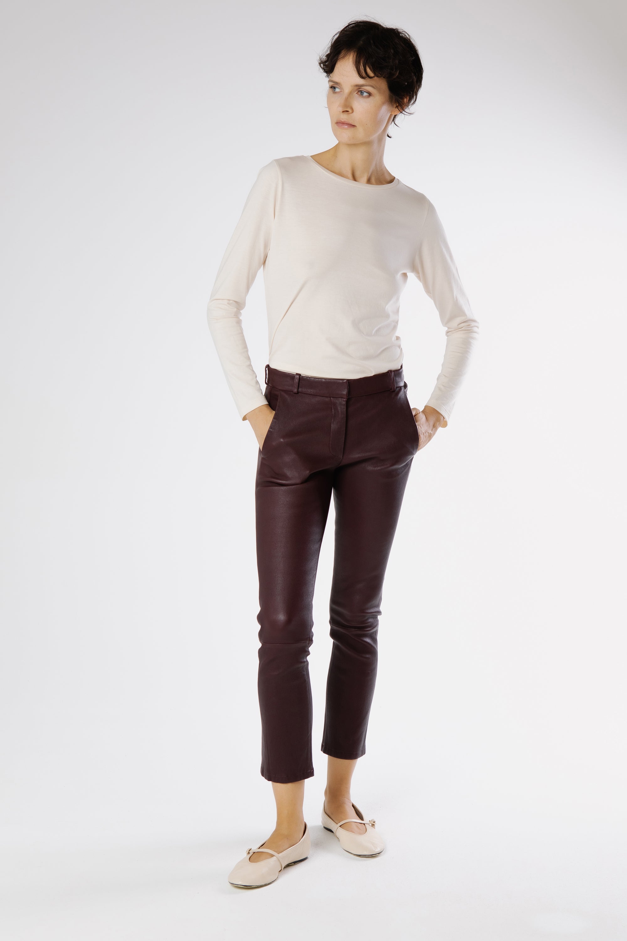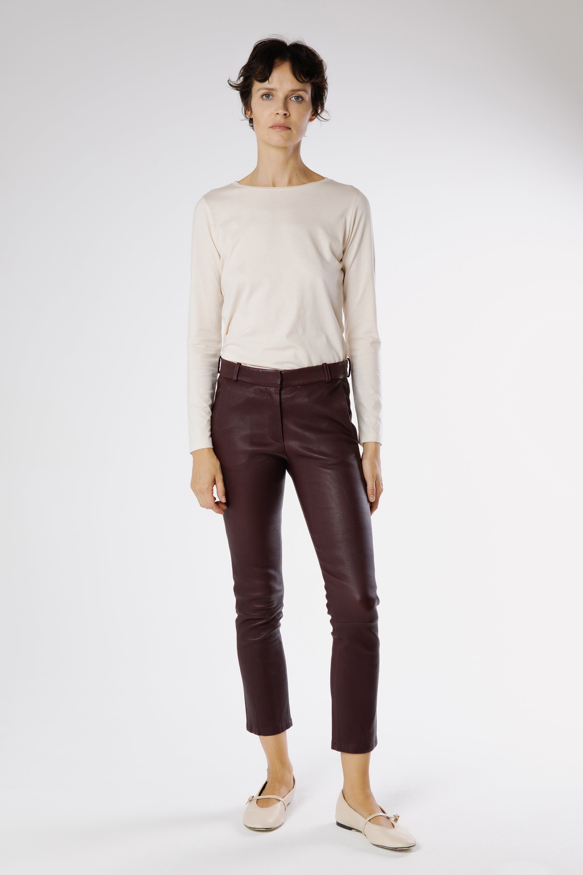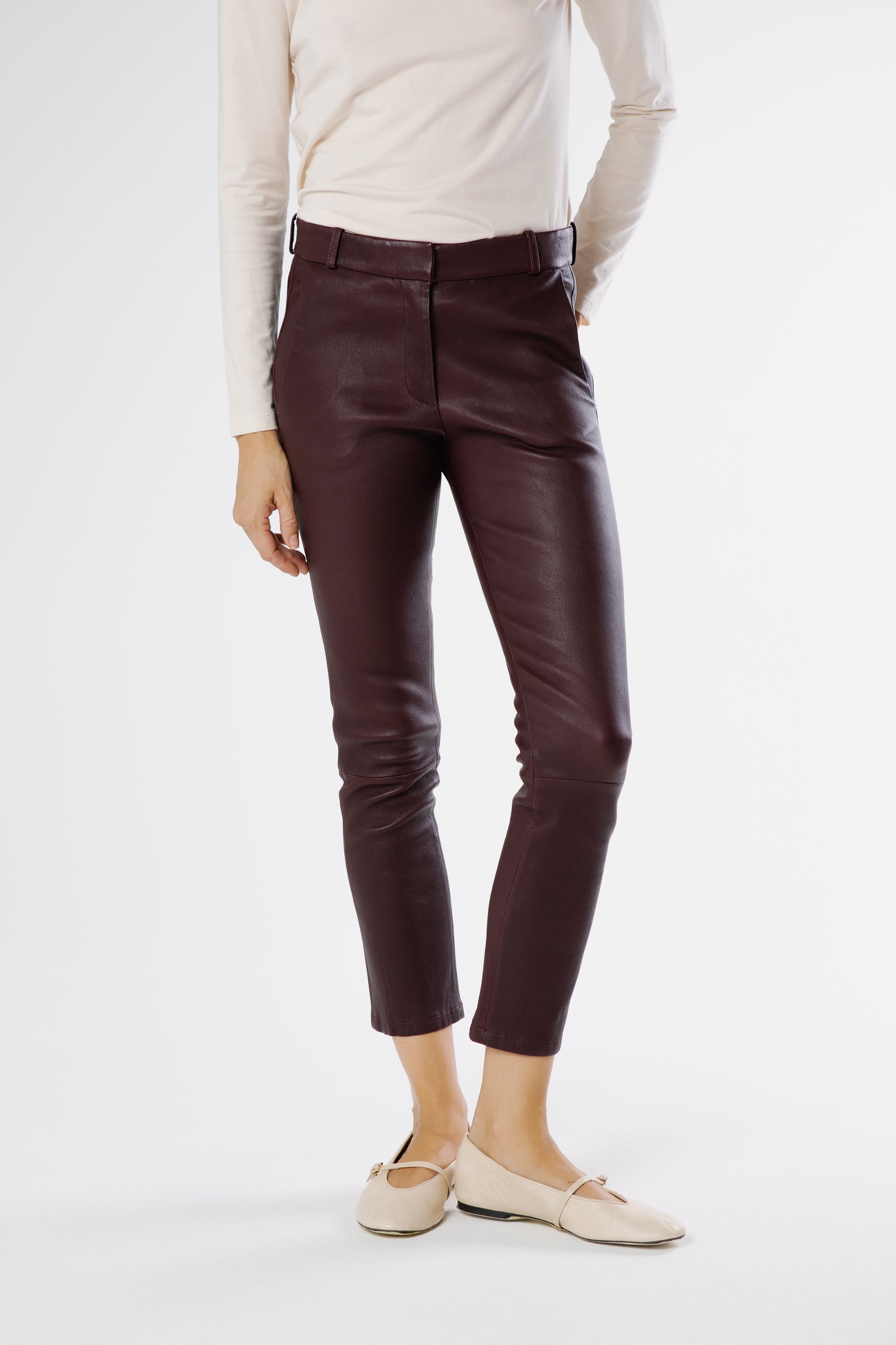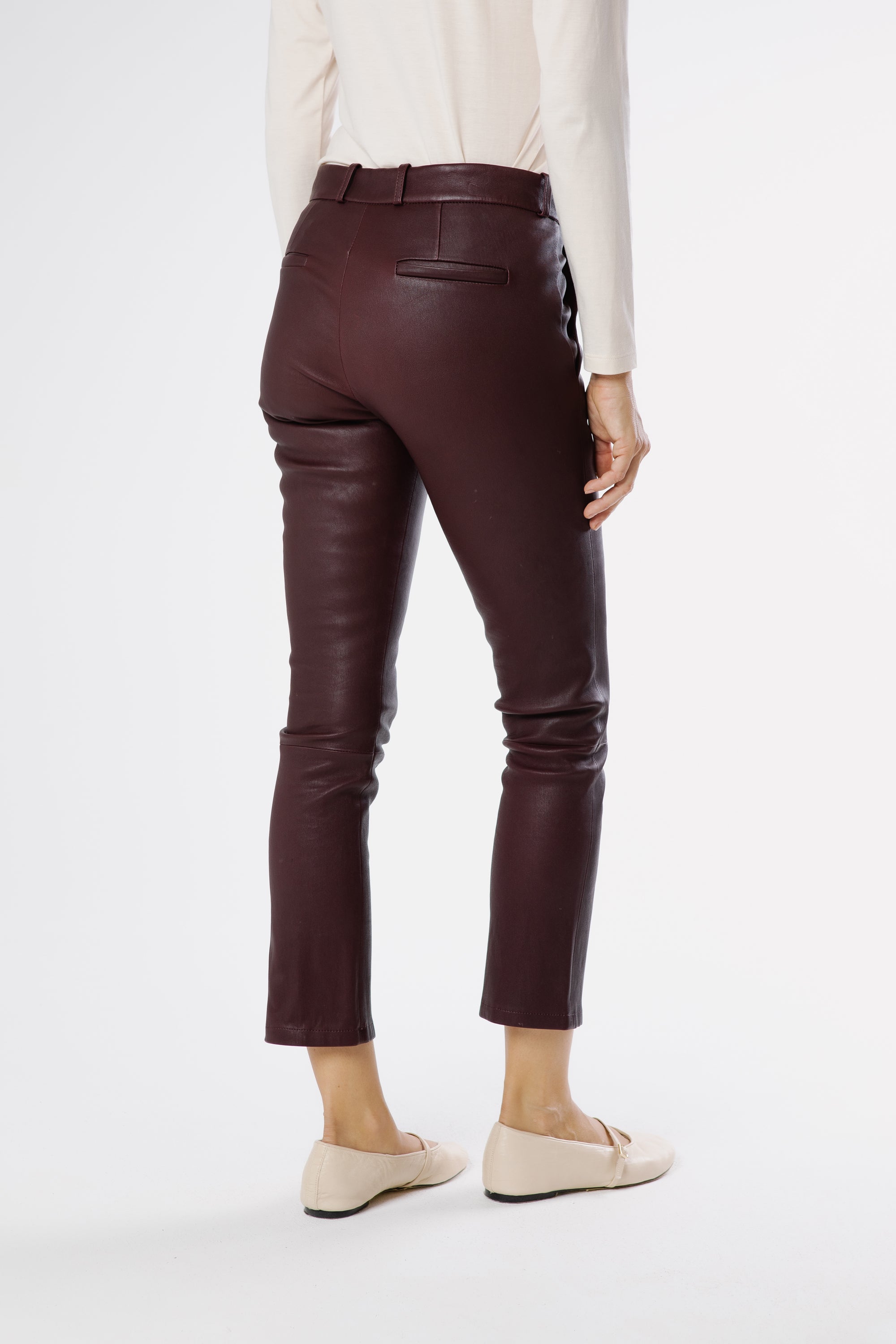 The Marina Na Leather Trousers in Shiraz feature a sleek, slim silhouette crafted from smooth, supple leather. Their deep Shiraz hue adds a refined richness, making them a versatile statement piece for both day and evening looks.